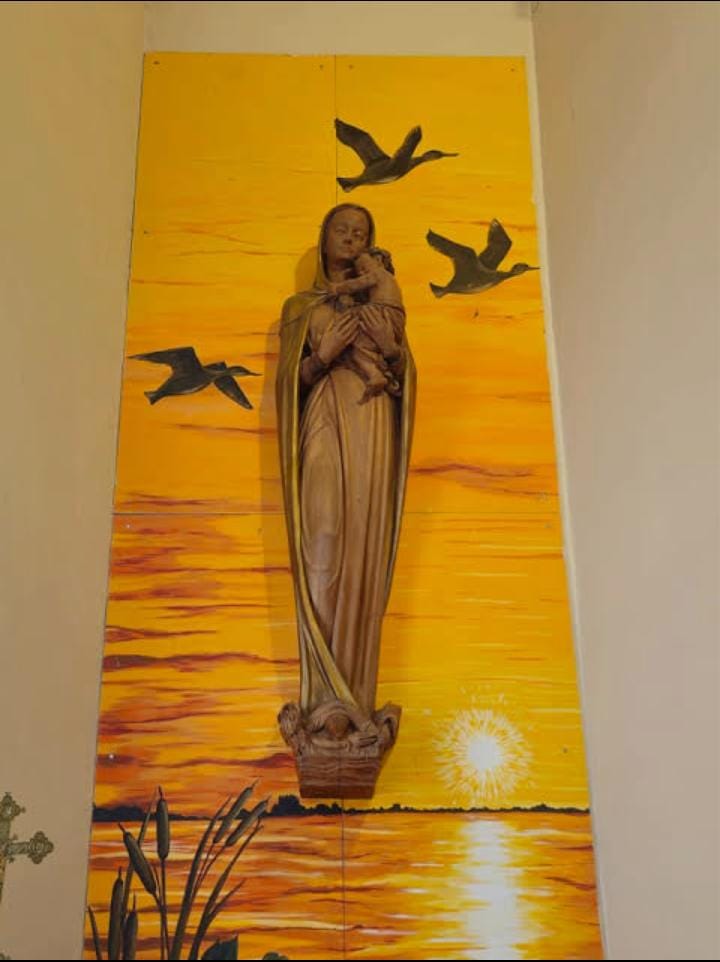 - La Imagen: Tallada en madera en la década de 1960 por el escultor alemán Leo Moroder. Representa a la Virgen sobre un embalsado (vegetación flotante) y una serpiente, con el Niño Dios aferrado a ella, reflejando la inestabilidad y el entorno del paisaje isleño.